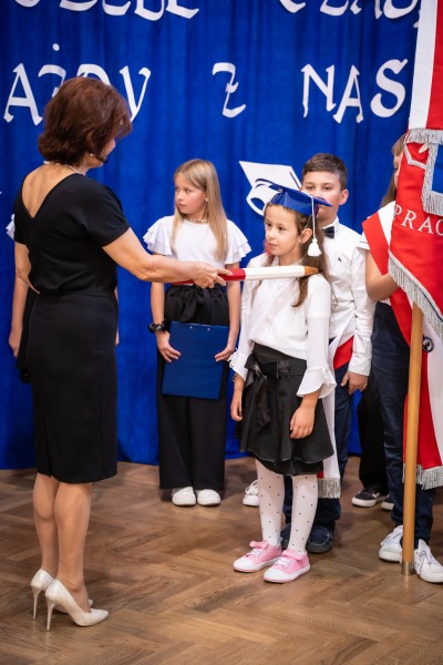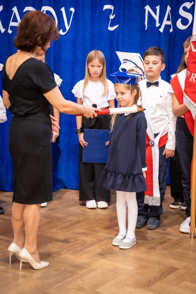 Wreszcie nadszedł moment rozpoczęcia. Najpierw uczniowie klasy czwartej powitali wszystkich zebranych na tej uroczystości. Następnie dzieci zaprezentowały swoje umiejętności – świetnie zdały wszystkie egzaminy, błysnęły talentem. Znajomość przepisów drogowych, pięknie zaśpiewane piosenki, przyjaźń i koleżeństwo w grupie rówieśniczej, znajomość zasad, to dowód, że dzieci są gotowe do sumiennej pracy w szkole. W podniosłej atmosferze, przed pocztem sztandarowym Pierwszacy ślubowali być dobrymi Polakami, godnie reprezentować swoją szkołę, swym zachowaniem i nauką sprawiać radość rodzicom i nauczycielom. Po złożeniu ślubowania pani dyrektor szkoły Barbara Polek dokonała symbolicznego pasowania na ucznia. ,,Pasuję Cię na ucznia”- mówiła pani dyrektor, dotykając ołówkiem- jak czarodziejską różdżką ramion swoich podopiecznych. Potem życzyła Pierwszakom sukcesów w nauce oraz zapewniała o pomocy i opiece starszych kolegów w szkole i poza nią. Następnie wychowawczyni klasy pani Renata Mączko wręczyła dzieciom pamiątkowe dyplomy, a przewodnicząca Rady Rodziców klasy pierwszej, pani Joanna Iwaniec złożyła na ręce dzieci drobne upominki. Przybyli w licznym gronie rodzice zorganizowali ,,słodkie” przyjęcie.