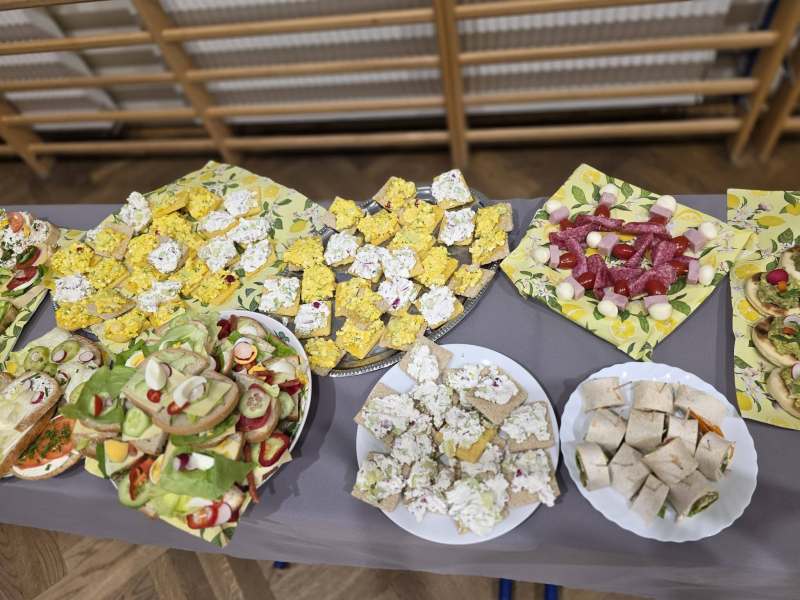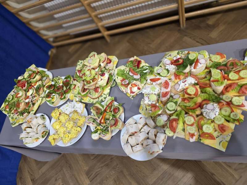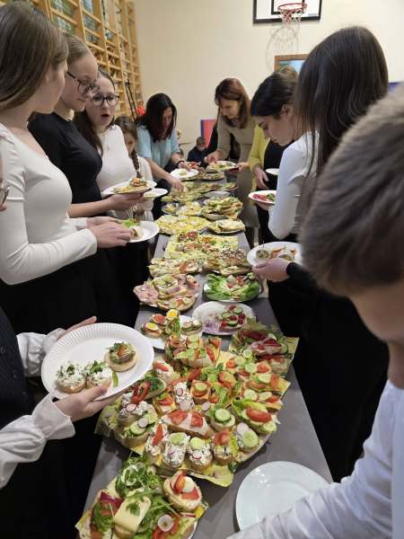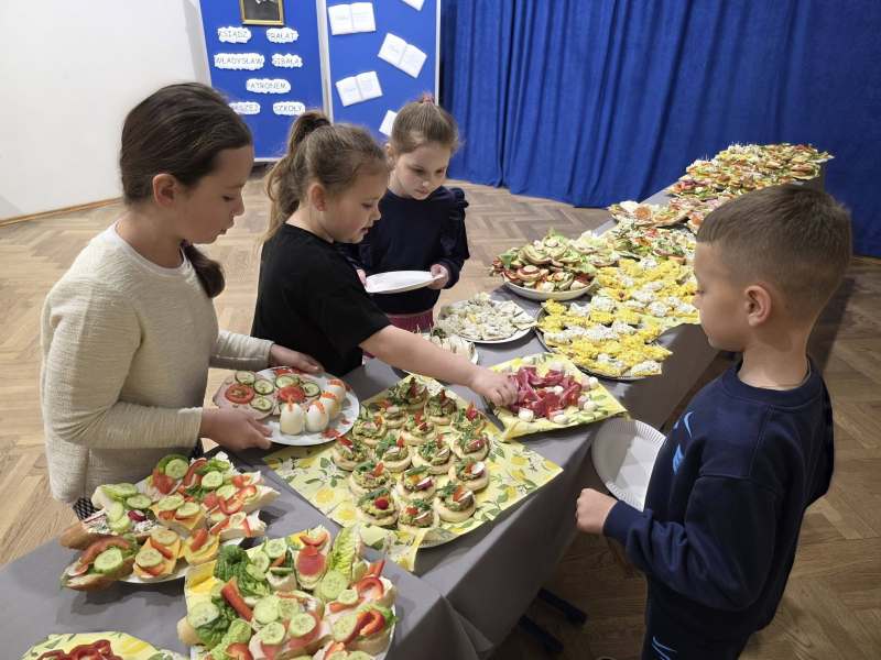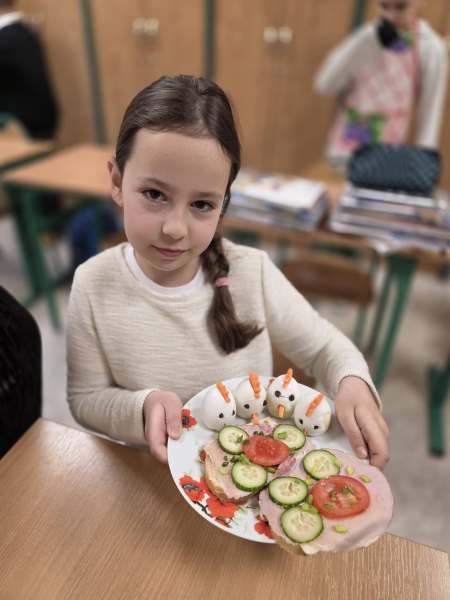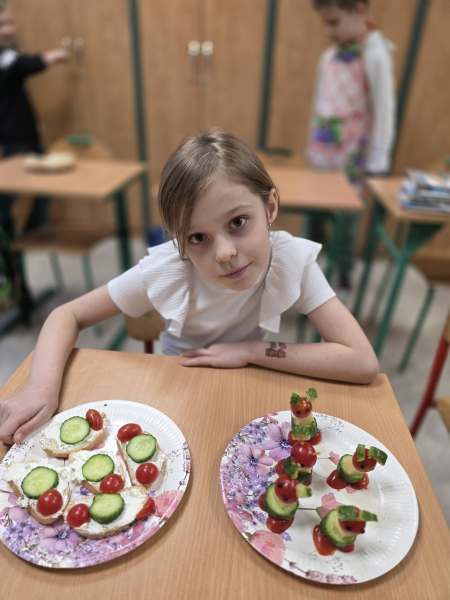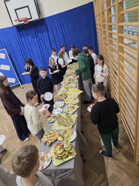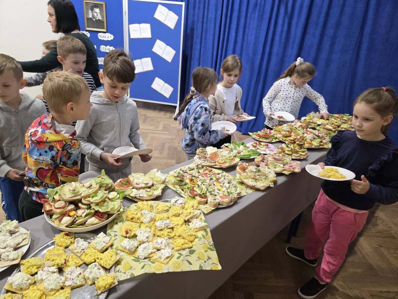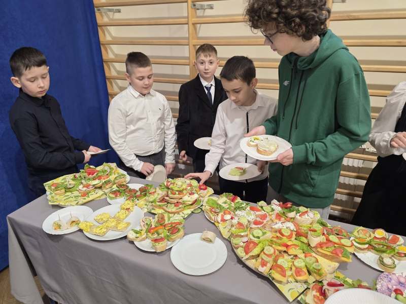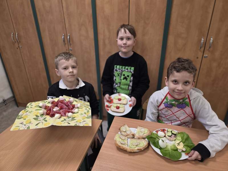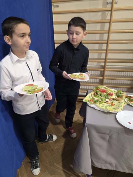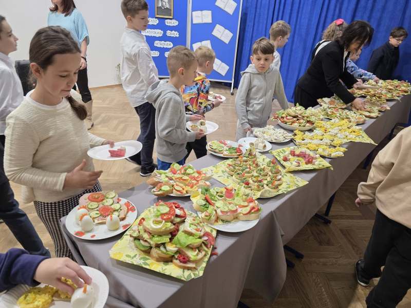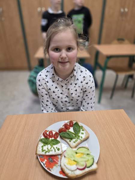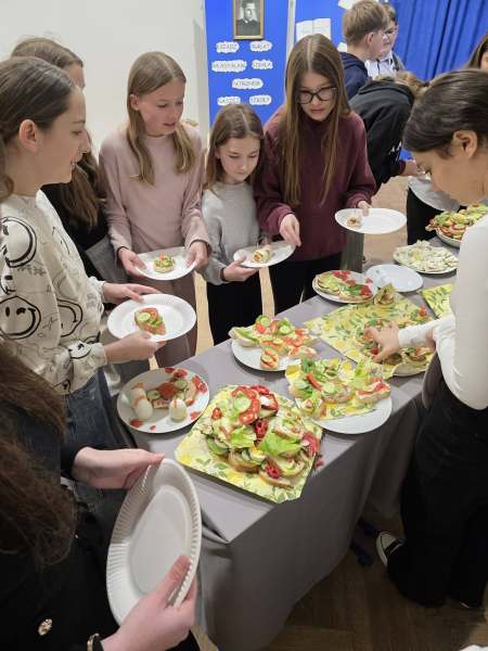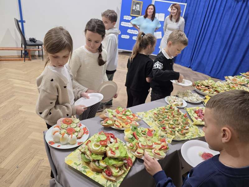 Potem nastąpiła część druga-prezentacja naszych umiejętności. Uczniowie własnoręcznie przygotowali zdrowe, wiosenne kanapki, które póżniej wspólnie degustowaliśmy. Były one bardzo różnorodne i kolorowe. Wszyscy uczniowie wspaniale się spisali. Patron mógłby być dumny.