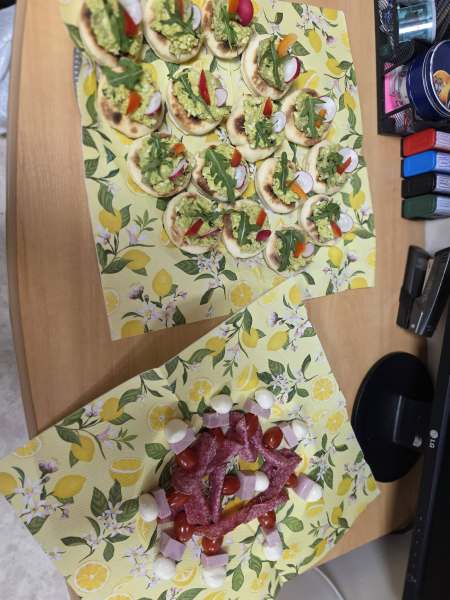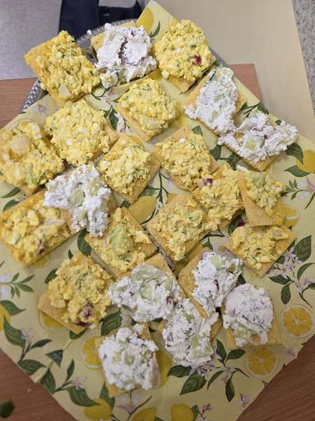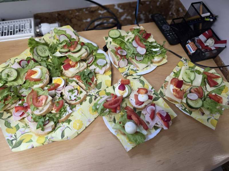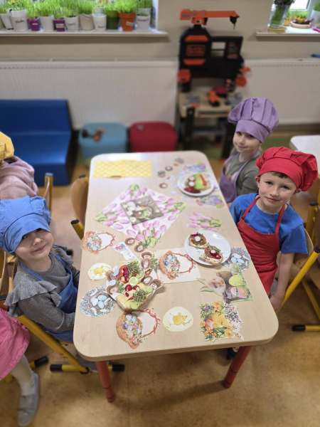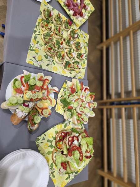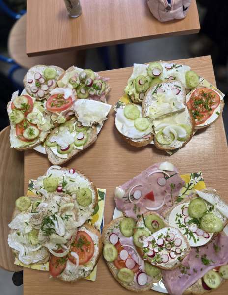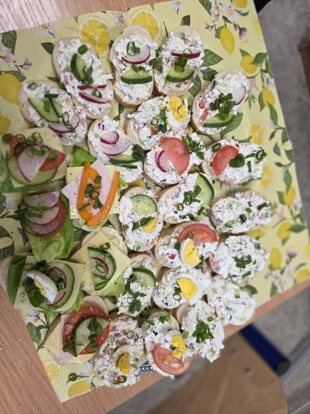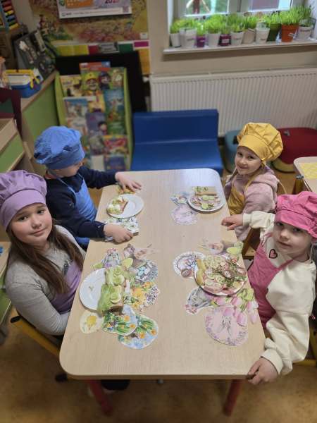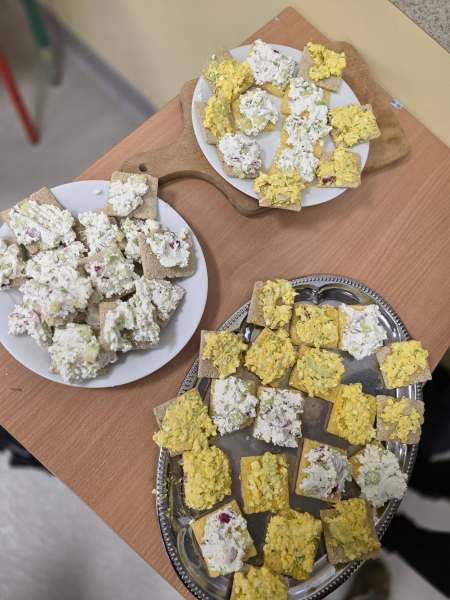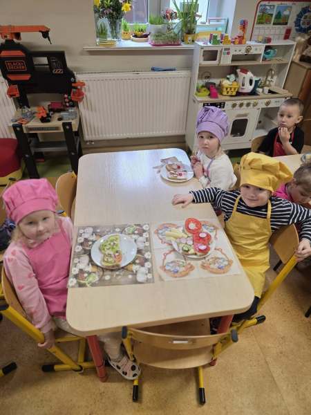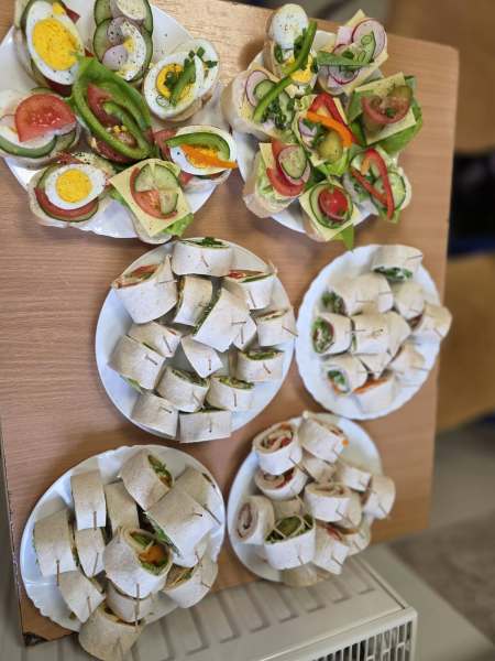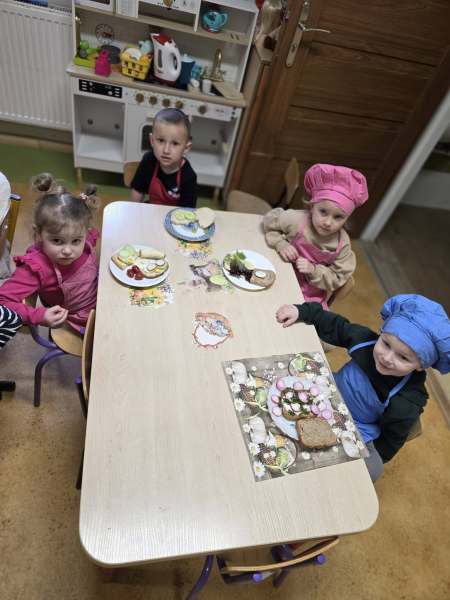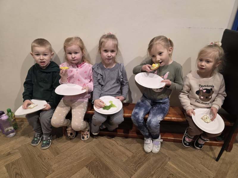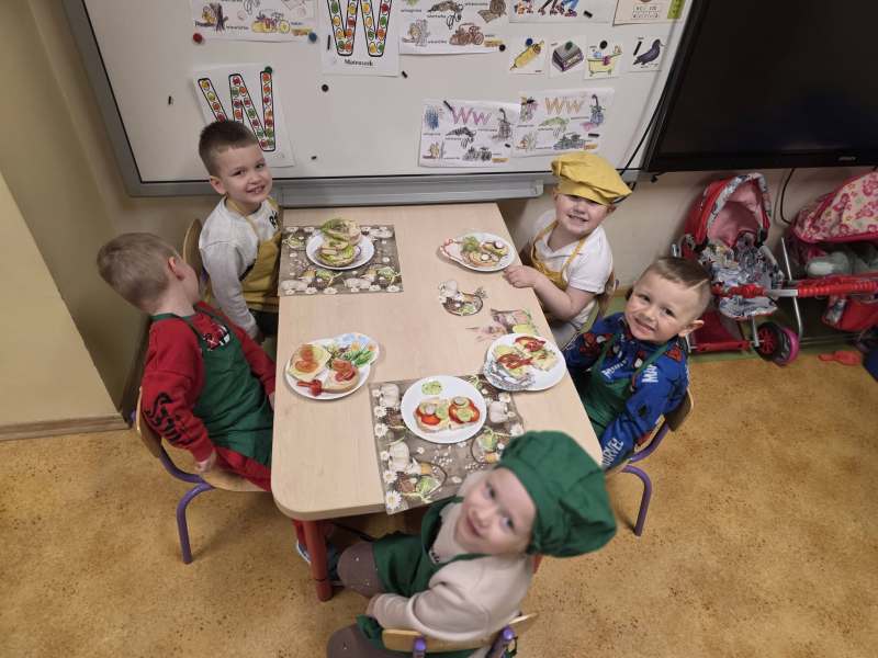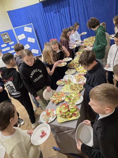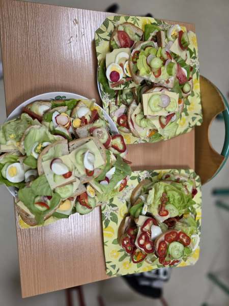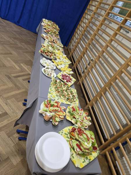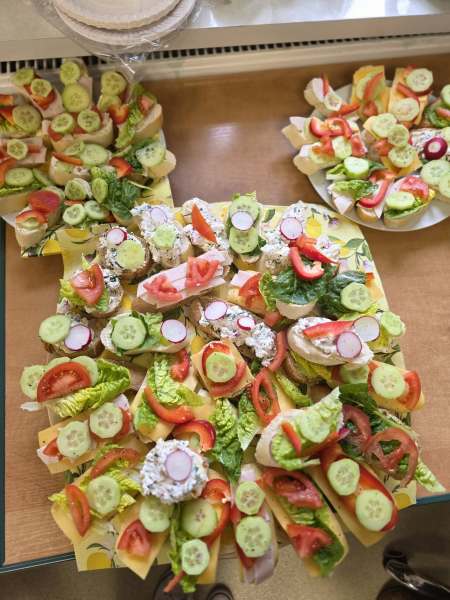 Potem nastąpiła część druga-prezentacja naszych umiejętności. Uczniowie własnoręcznie przygotowali zdrowe, wiosenne kanapki, które póżniej wspólnie degustowaliśmy. Były one bardzo różnorodne i kolorowe. Wszyscy uczniowie wspaniale się spisali. Patron mógłby być dumny.
