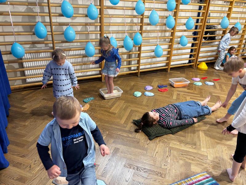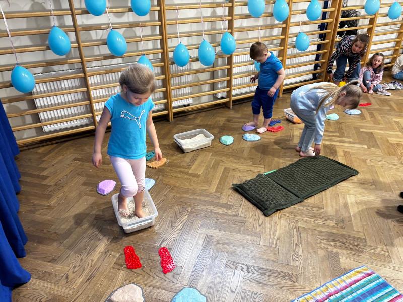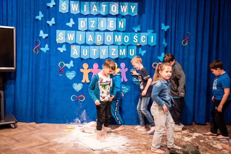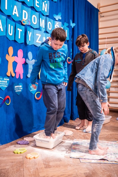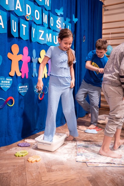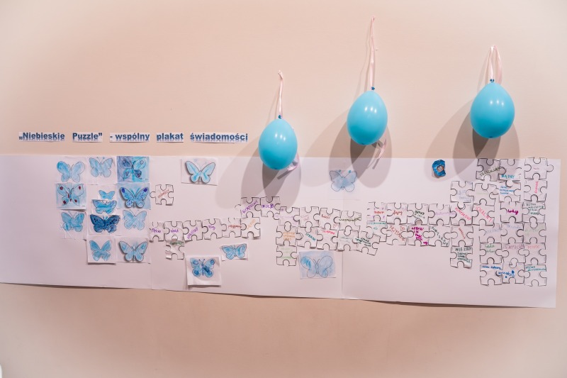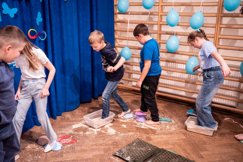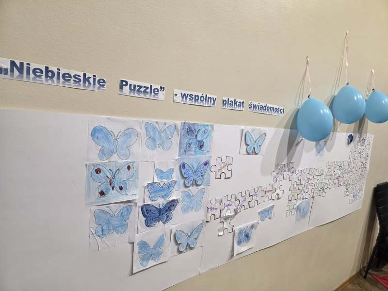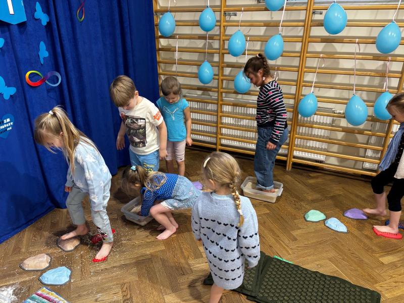 Dodatkową atrakcją była ścieżka sensoryczna, przez którą przeszedł każdy uczeń i przedszkolak, mogąc lepiej zrozumieć różnorodność odbierania bodźców. Na zakończenie każda klasa wykonała pracę plastyczną. Niebieskie motyle z różnych materiałów, symbolizowały wrażliwość, różnorodność i piękno każdego człowieka.