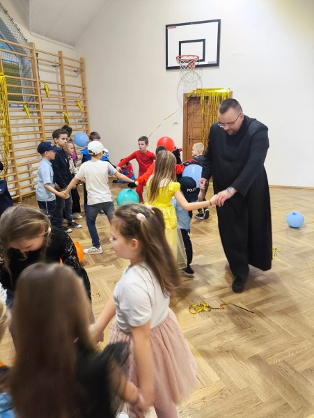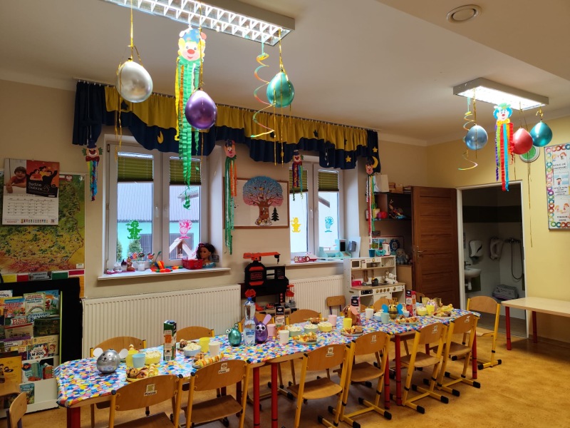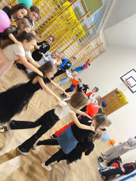 Przedszkolaki z entuzjazmem brały udział w tańcach i wspólnym śpiewaniu, a także w różnorodnych zabawach ruchowych. Dużo radości przyniosły zabawy z kolorową chustą animacyjną, które integrowały grupę i zachęcały do współpracy. Nie zabrakło również emocjonujących konkursów – skakanie w workach wzbudziło wiele śmiechu i zdrowej rywalizacji. Dzieci chętnie uczestniczyły w zabawie „kaczuszki” oraz wesołym „pociągu”, który przemierzał całą salę, porywając wszystkich do wspólnej zabawy. Po licznych atrakcjach na uczestników czekał smaczny poczęstunek, który był miłym momentem odpoczynku i regeneracji sił.