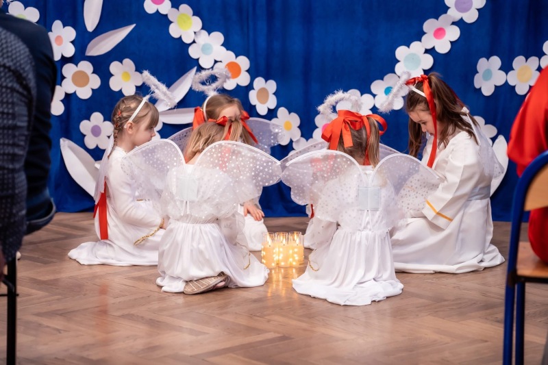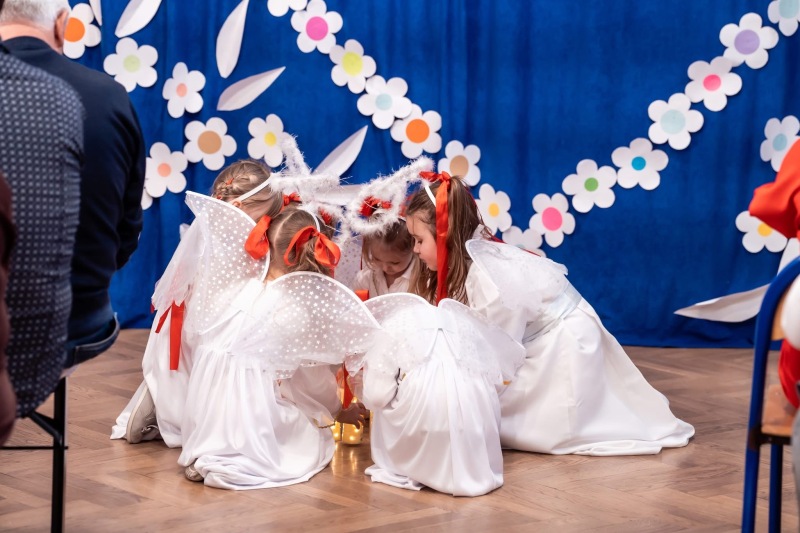 „Nad stajenką gwiazdka świeci, do stajenki idą dzieci.” Przedszkolaki pod bacznym okiem opiekunek, starannie ubrane oraz z wielką tremą przystąpiły do przedstawienia. Efektowne dekoracje oddające nastrój ówczesnych czasów, piękne kolędy i pastorałki przeniosły wszystkich do Betlejem. Maryja z Dzieciątkiem, Józef, śpiewające aniołki, gromadka dzieci oraz Trzej Królowie to postaci iście z tamtej epoki. Aktorzy debiutanci bardzo przejęci swoimi rolami z ogromnym zaangażowaniem odgrywali swoje sceny z Biblii. Maluchy czy to starszaki nie żałowały gardeł przy śpiewie kolęd. Każdy chciał pokazać się z jak najlepszej strony. Za trud włożony w przedstawienie serdecznie dziękujemy naszym milusińskim. Dla wszystkich gromkie BRAWO.
