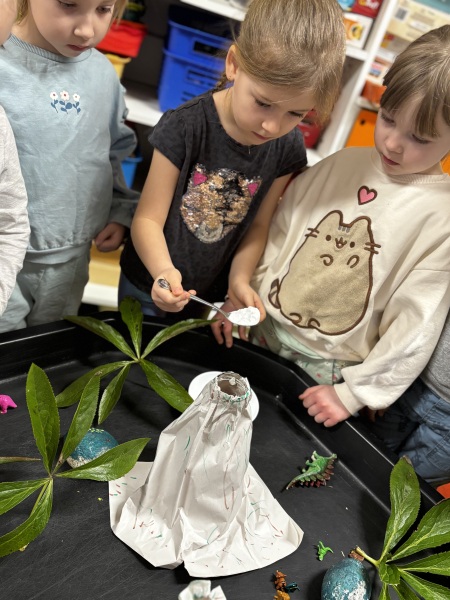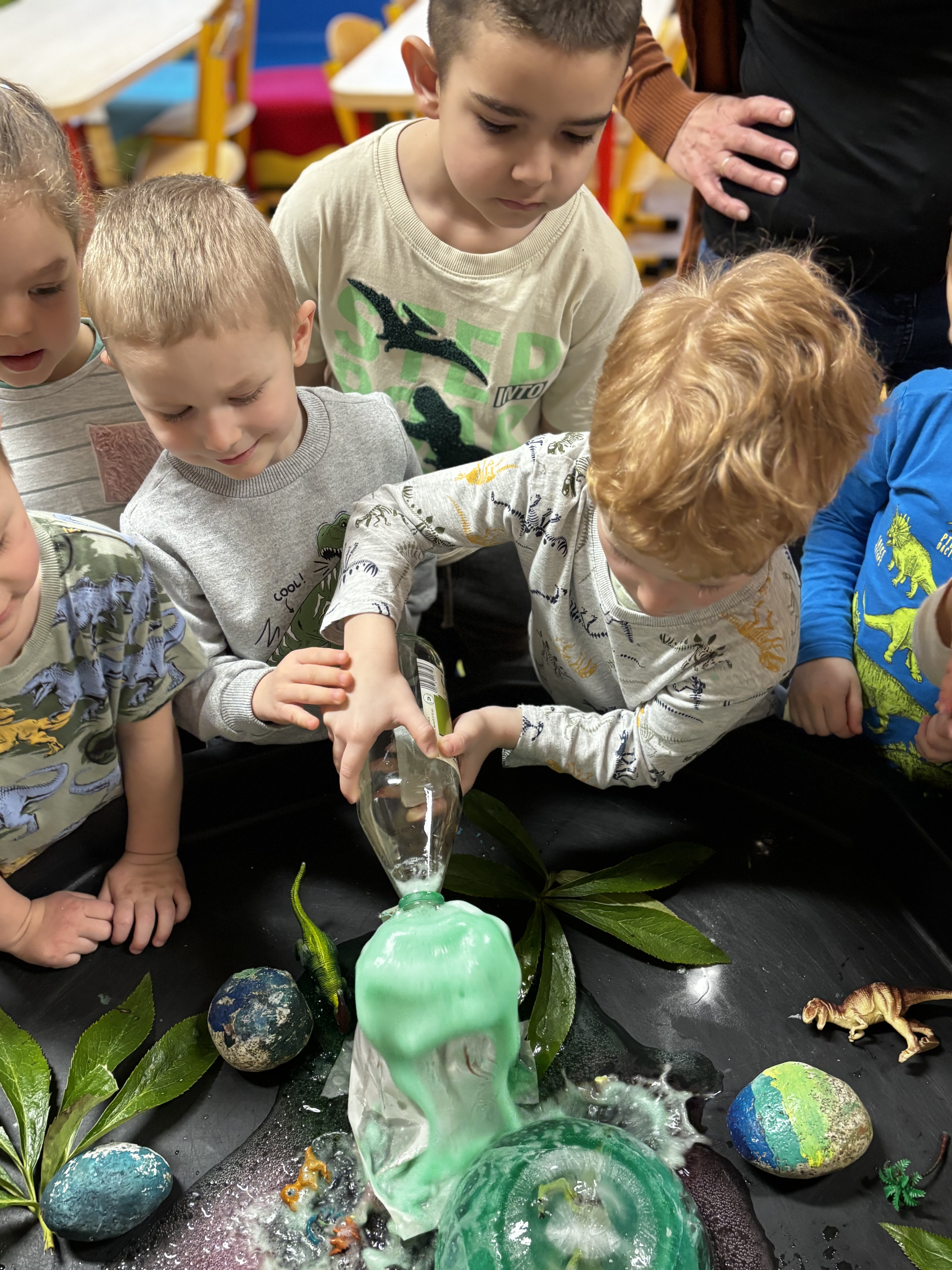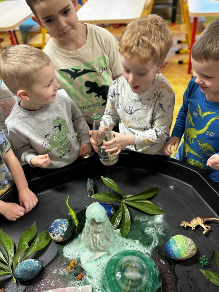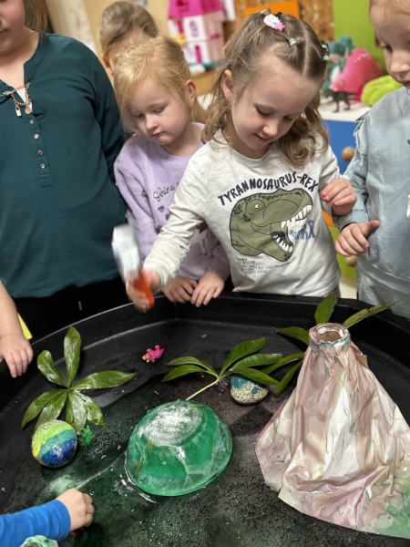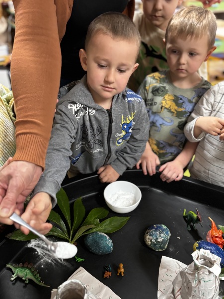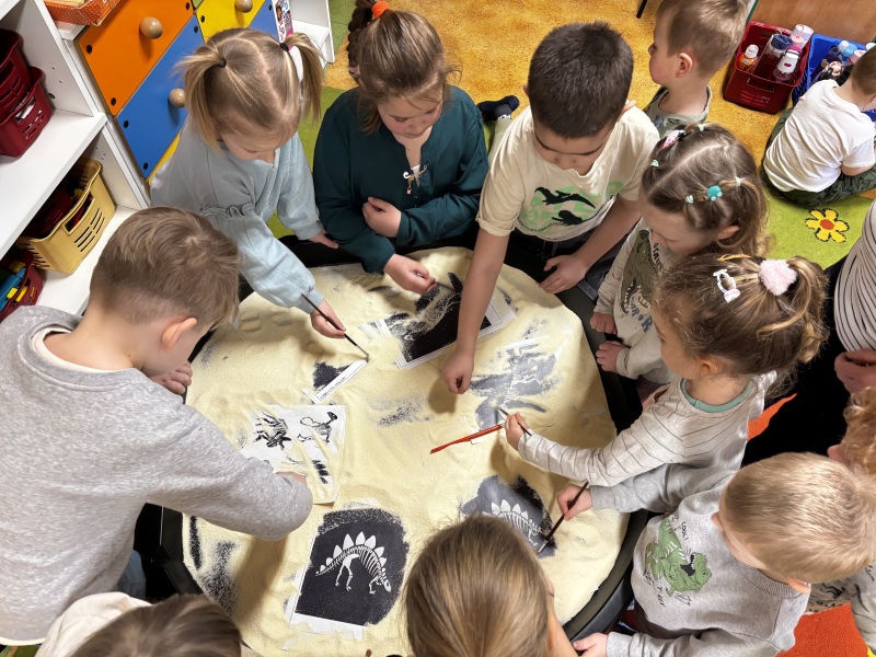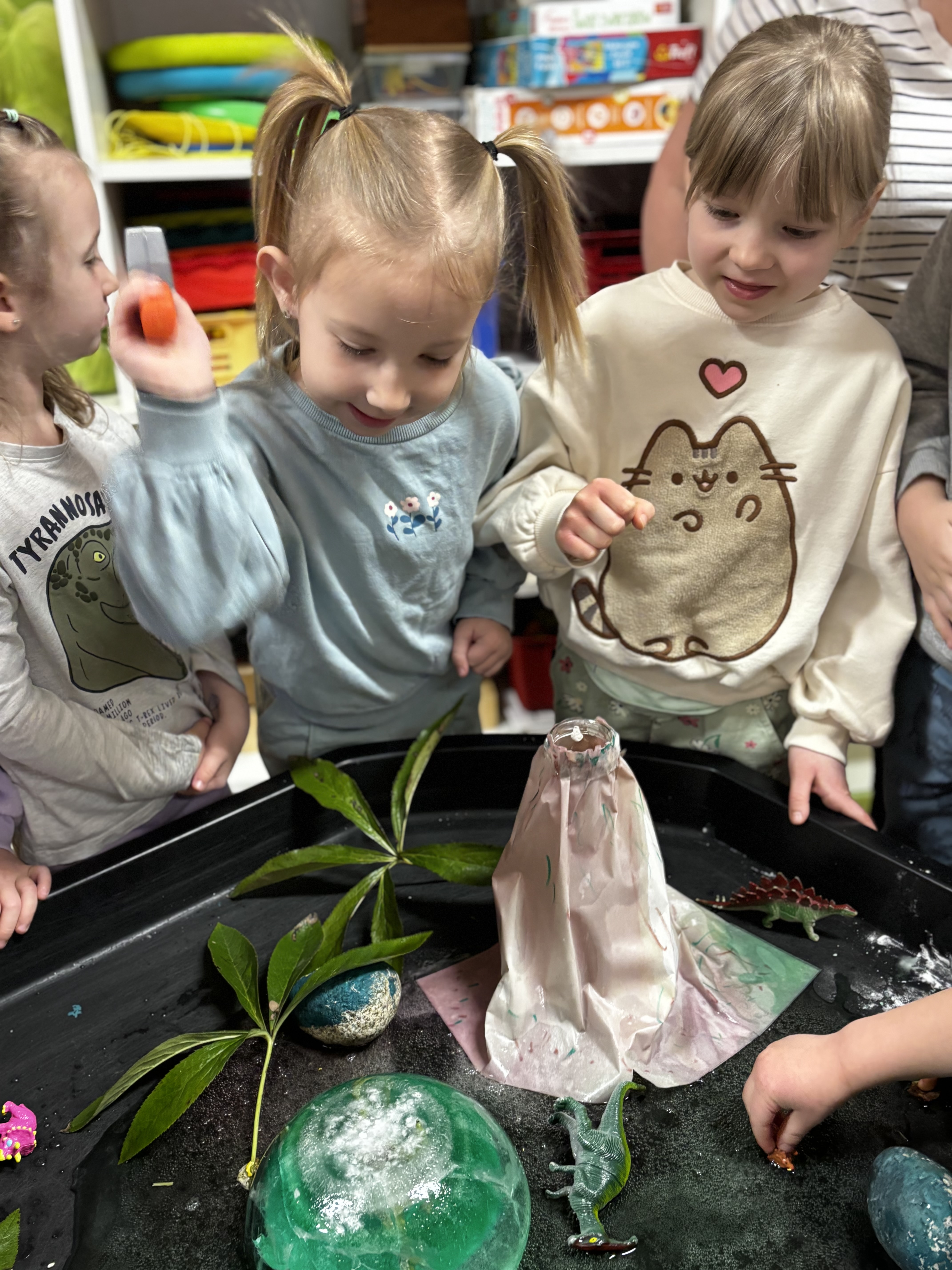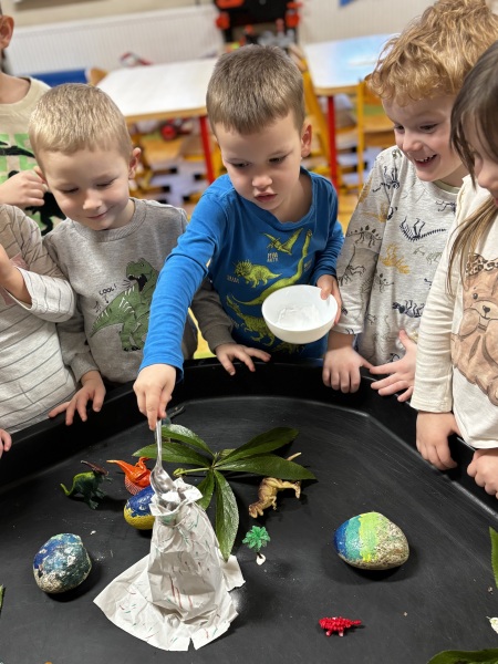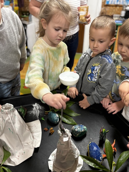 Robiliśmy wulkany – dzieci z ogromnym zaciekawieniem obserwowały „erupcję lawy”. Eksperyment wzbudził wiele emocji i był świetną okazją do poznania ciekawostek o dawnym świecie dinozaurów. Układaliśmy dinozaury – przedszkolaki tworzyły modele z klocków i puzzli, rozwijając przy tym wyobraźnię oraz zdolności manualne. Zabawa w paleontologów – mali badacze z wielkim zaangażowaniem poszukiwali „skamieniałości” ukrytych w piasku. Odkrywanie kości dinozaurów sprawiło im ogromną radość! Kolorowanie dinozaurów – powstały przepiękne, kolorowe prace, które ozdobiły naszą salę.