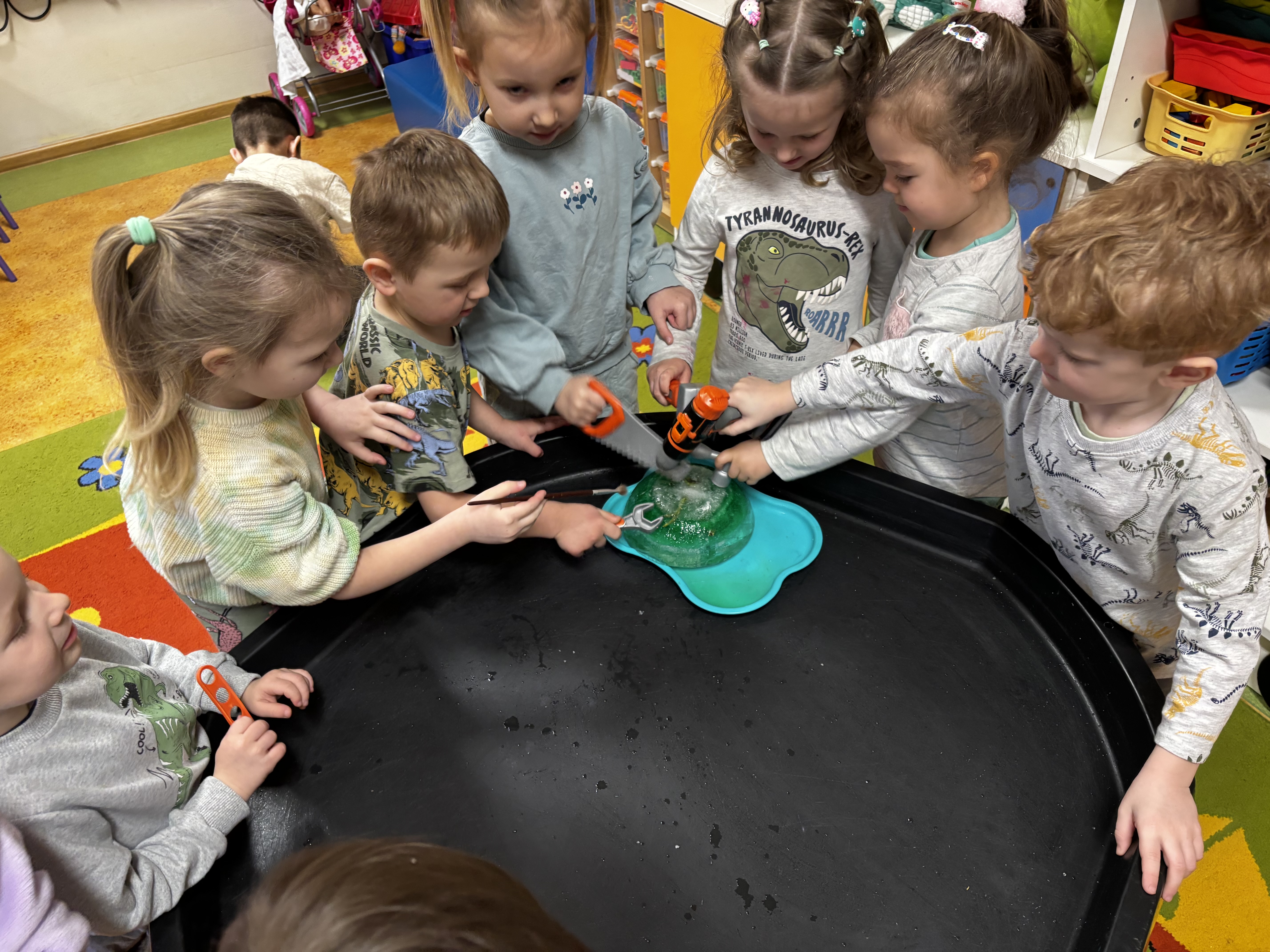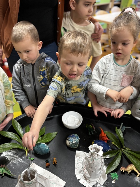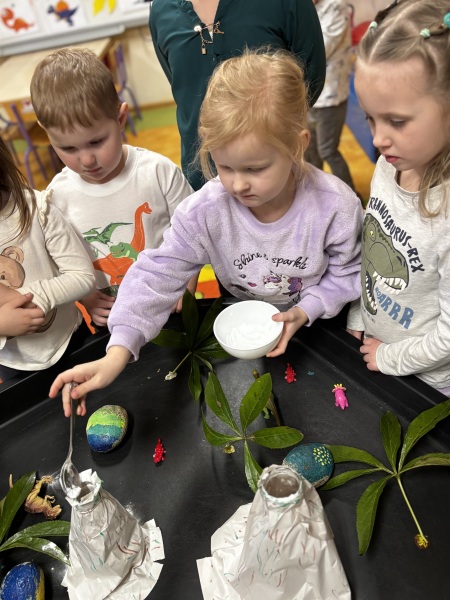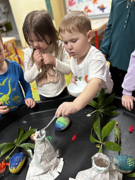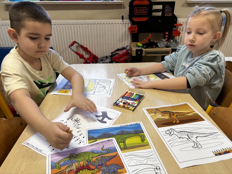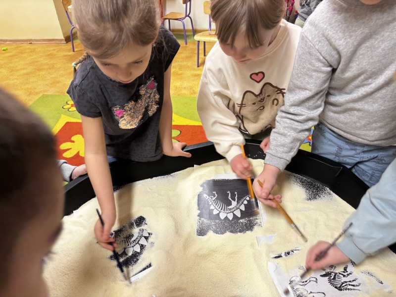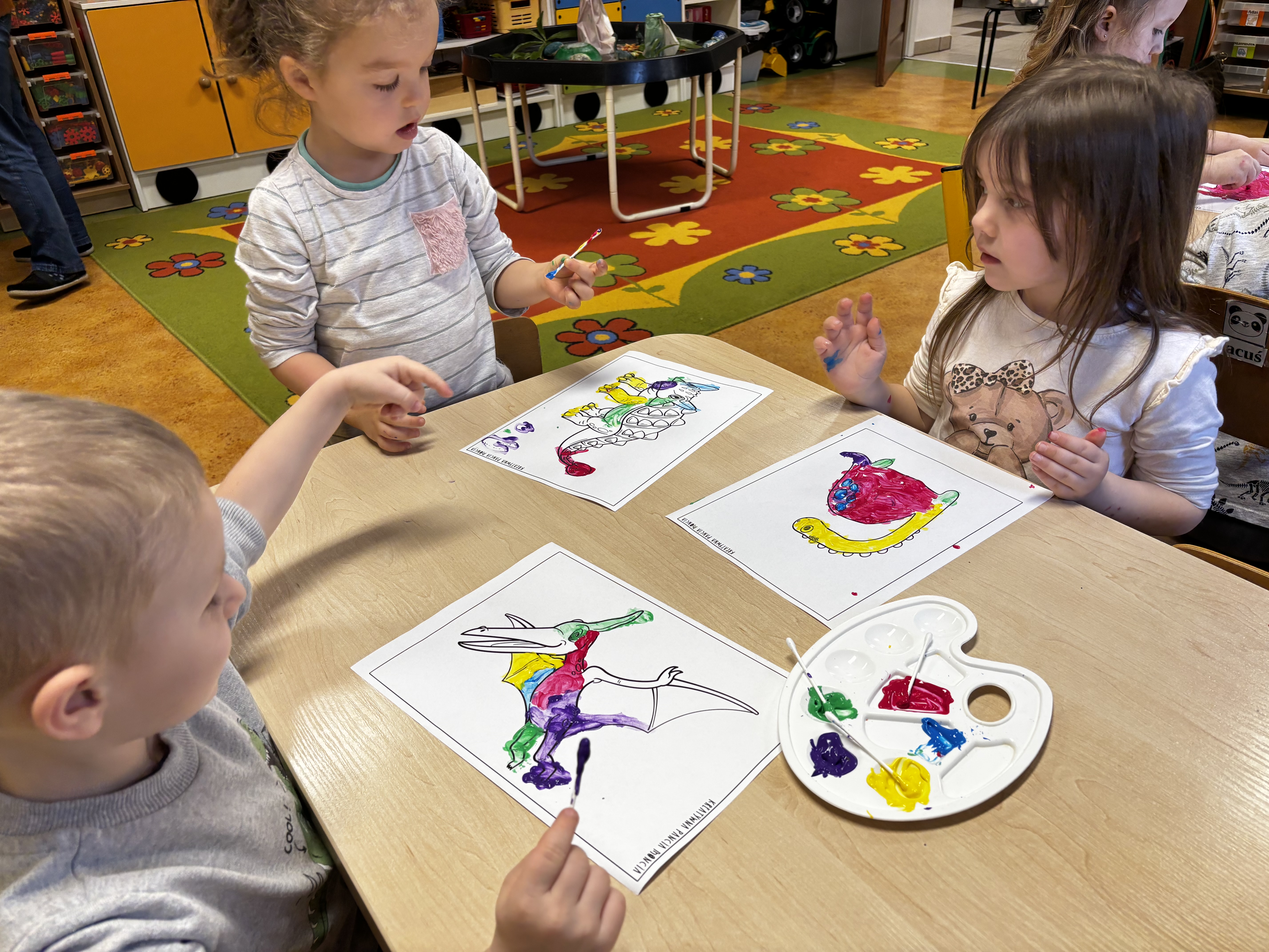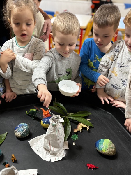 Robiliśmy wulkany – dzieci z ogromnym zaciekawieniem obserwowały „erupcję lawy”. Eksperyment wzbudził wiele emocji i był świetną okazją do poznania ciekawostek o dawnym świecie dinozaurów. Układaliśmy dinozaury – przedszkolaki tworzyły modele z klocków i puzzli, rozwijając przy tym wyobraźnię oraz zdolności manualne. Zabawa w paleontologów – mali badacze z wielkim zaangażowaniem poszukiwali „skamieniałości” ukrytych w piasku. Odkrywanie kości dinozaurów sprawiło im ogromną radość! Kolorowanie dinozaurów – powstały przepiękne, kolorowe prace, które ozdobiły naszą salę.