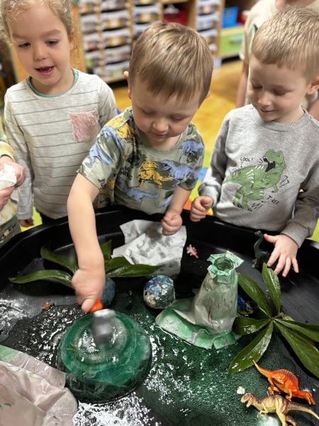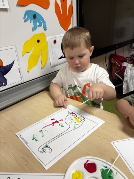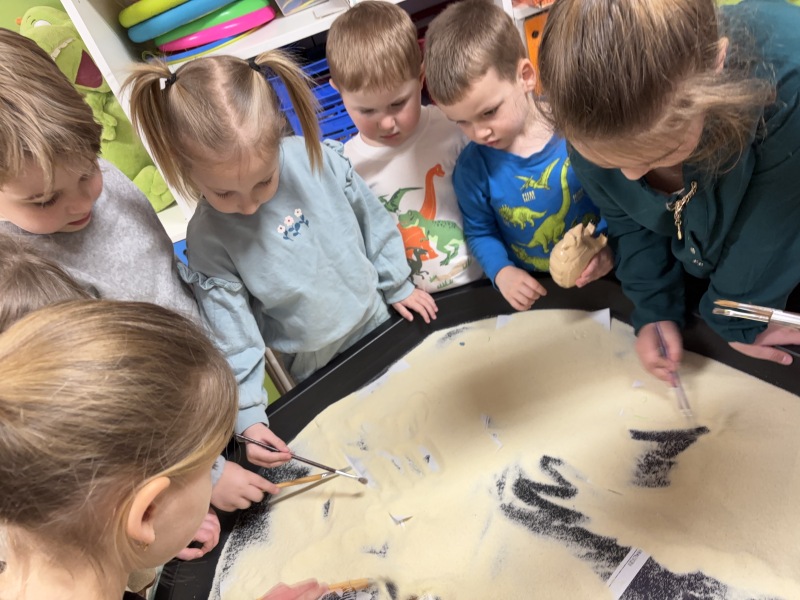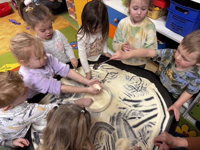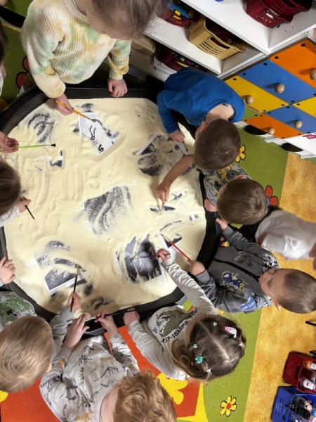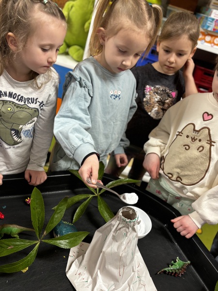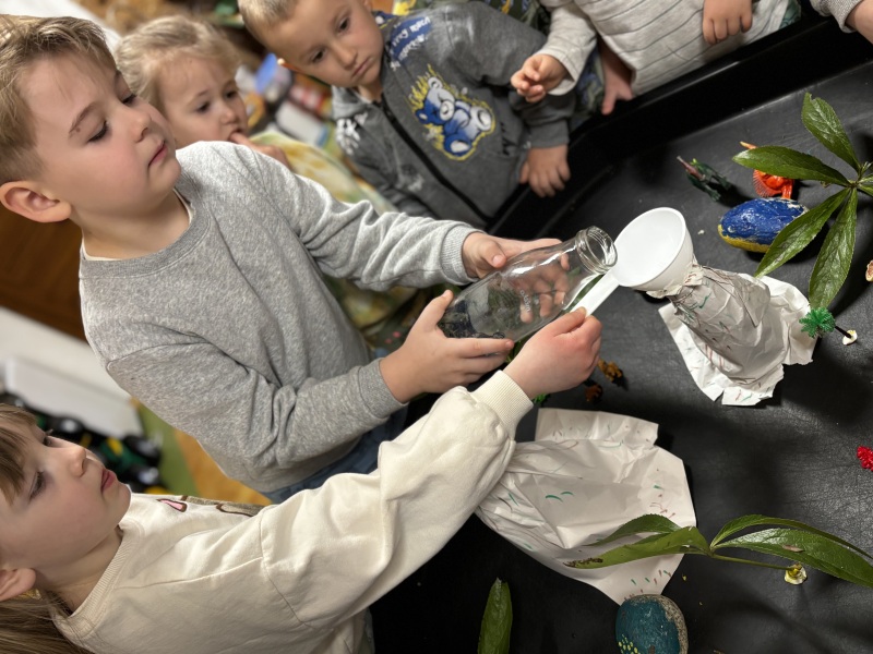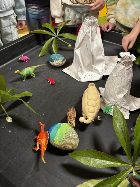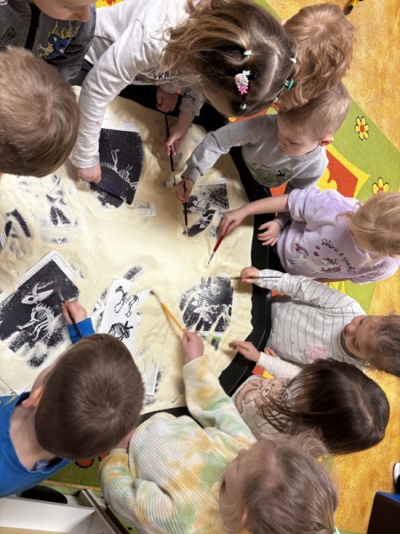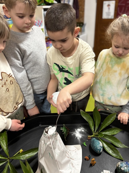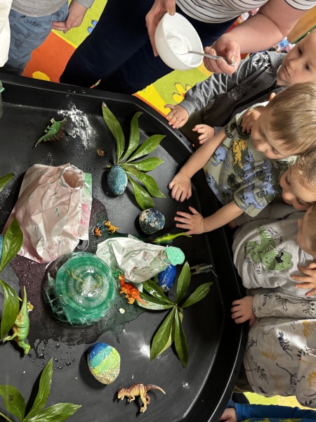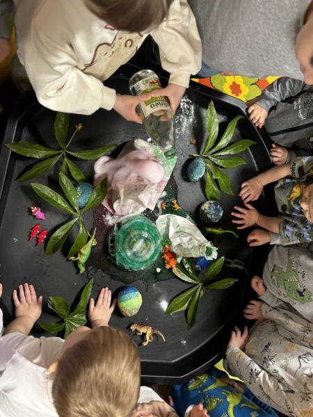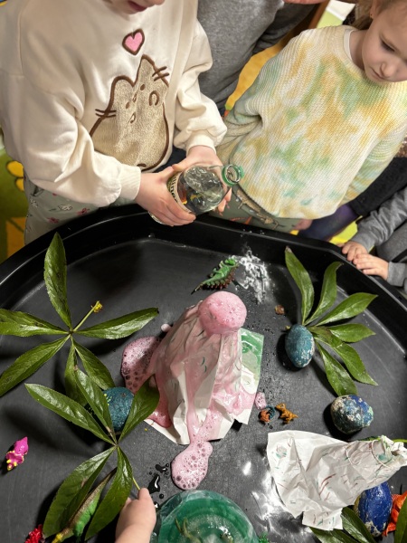 Robiliśmy wulkany – dzieci z ogromnym zaciekawieniem obserwowały „erupcję lawy”. Eksperyment wzbudził wiele emocji i był świetną okazją do poznania ciekawostek o dawnym świecie dinozaurów. Układaliśmy dinozaury – przedszkolaki tworzyły modele z klocków i puzzli, rozwijając przy tym wyobraźnię oraz zdolności manualne. Zabawa w paleontologów – mali badacze z wielkim zaangażowaniem poszukiwali „skamieniałości” ukrytych w piasku. Odkrywanie kości dinozaurów sprawiło im ogromną radość! Kolorowanie dinozaurów – powstały przepiękne, kolorowe prace, które ozdobiły naszą salę.