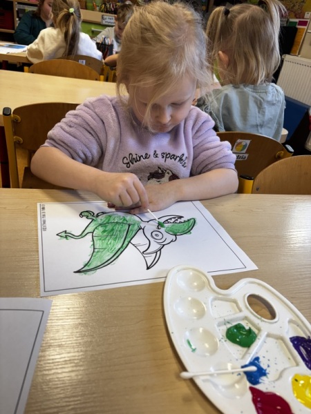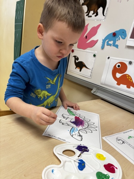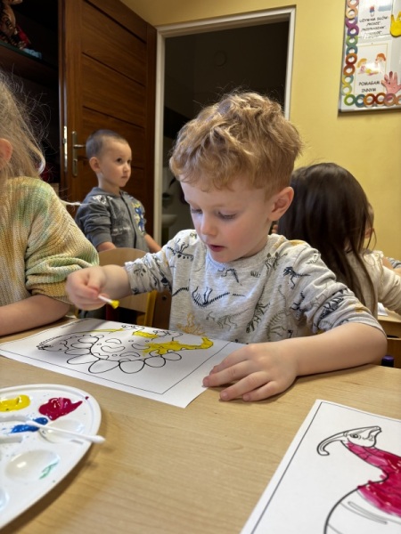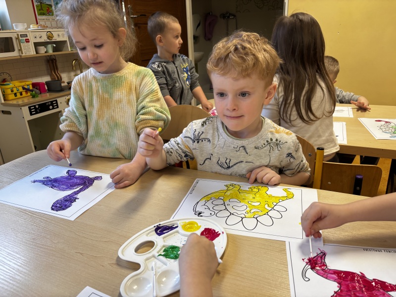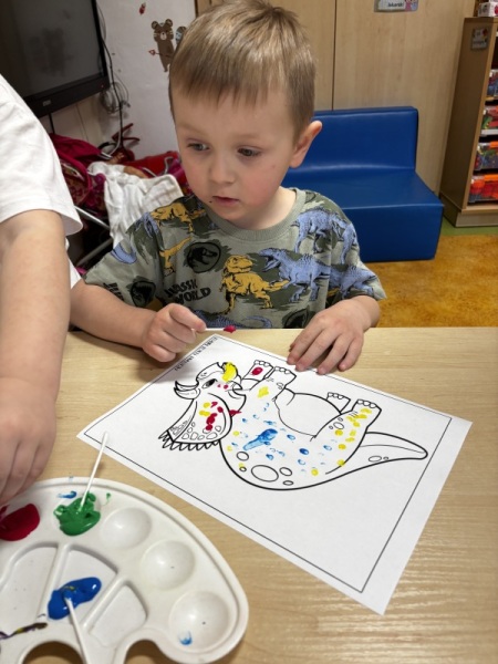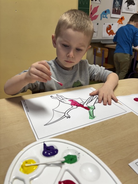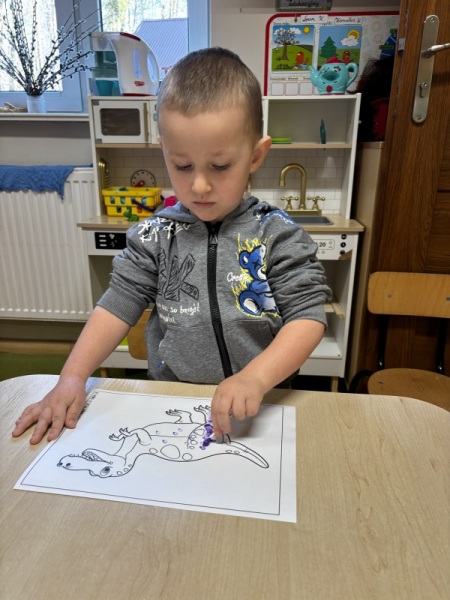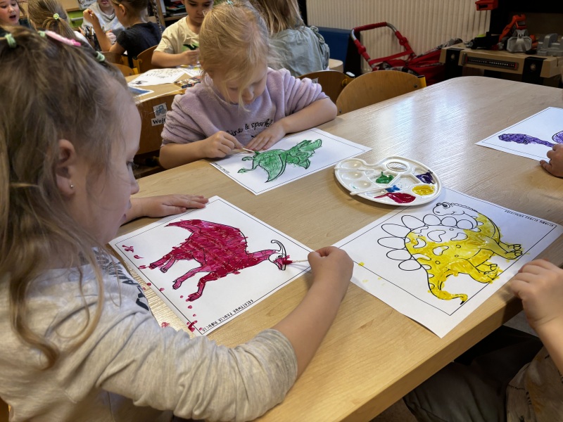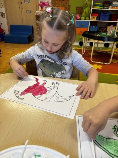 Dzieci w tym dniu przyniosły swoje kolekcje dinozaurów, gry, książki o tej fascynujacej tematyce. Największą radość sprawiło im wykonanie modelu dinozaura z balona. Na zakończenie tematu wszystkie dzieci wymalowaly farbami kolorowanki z ulubionym dinozaurem