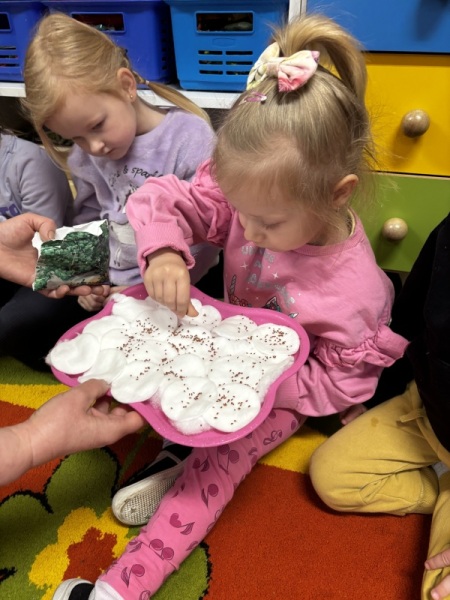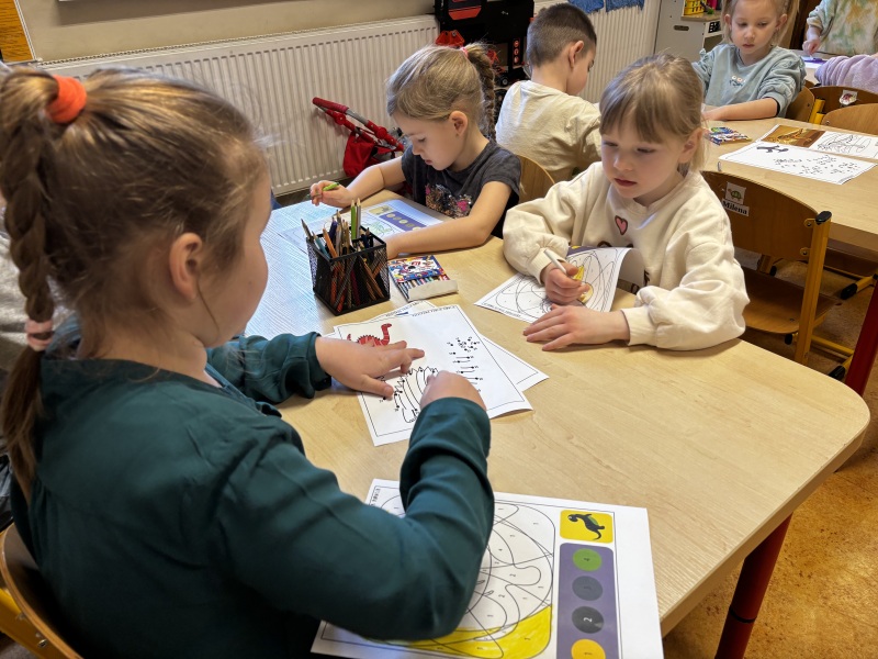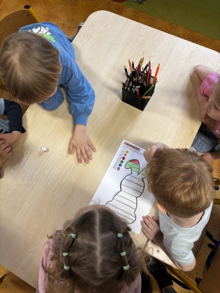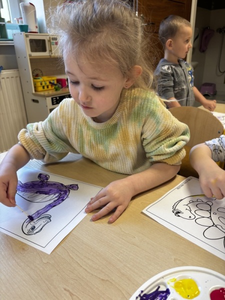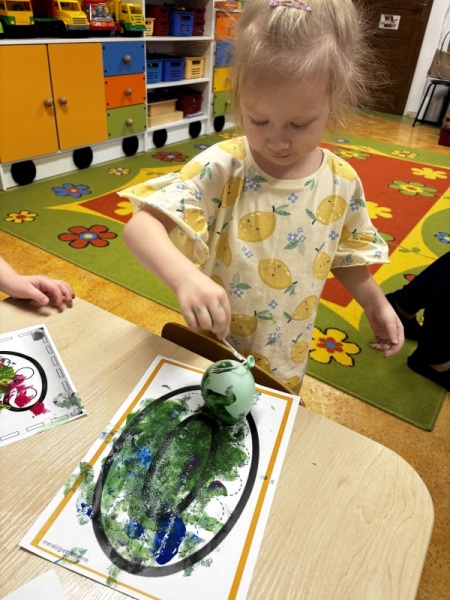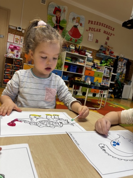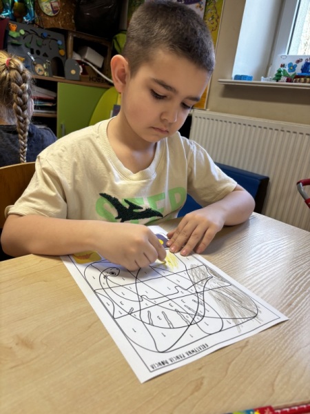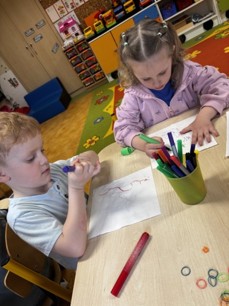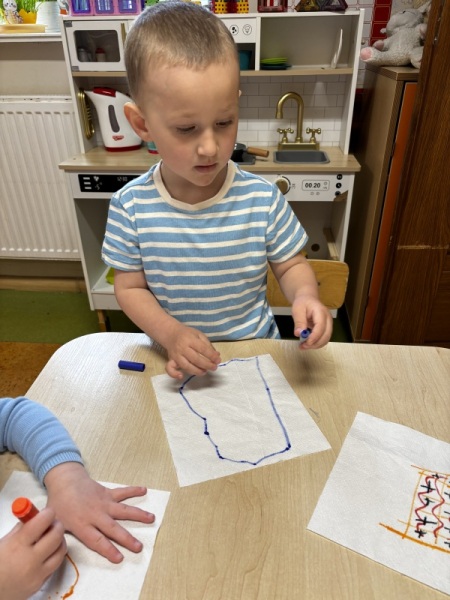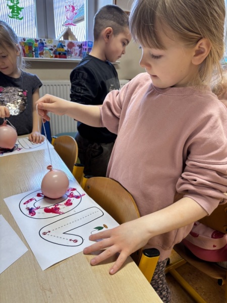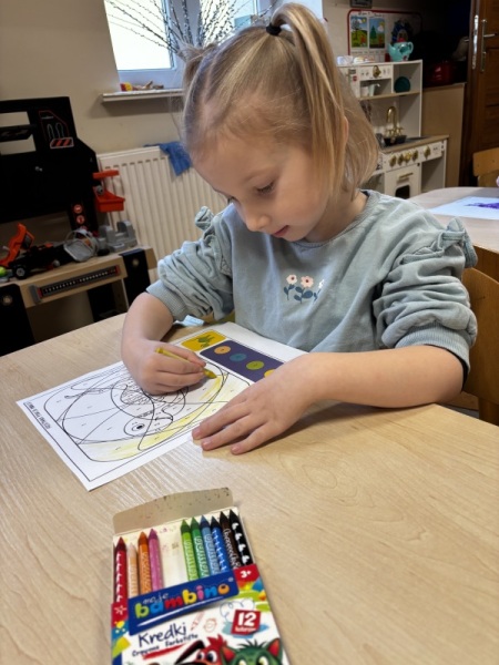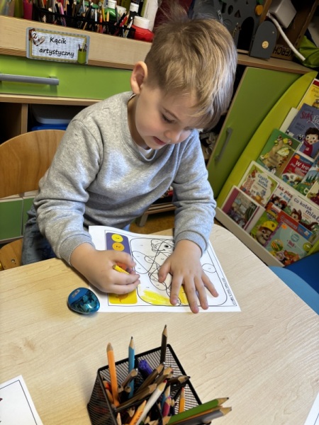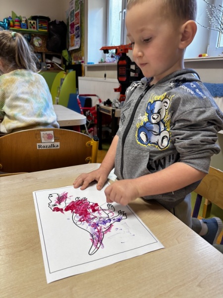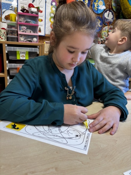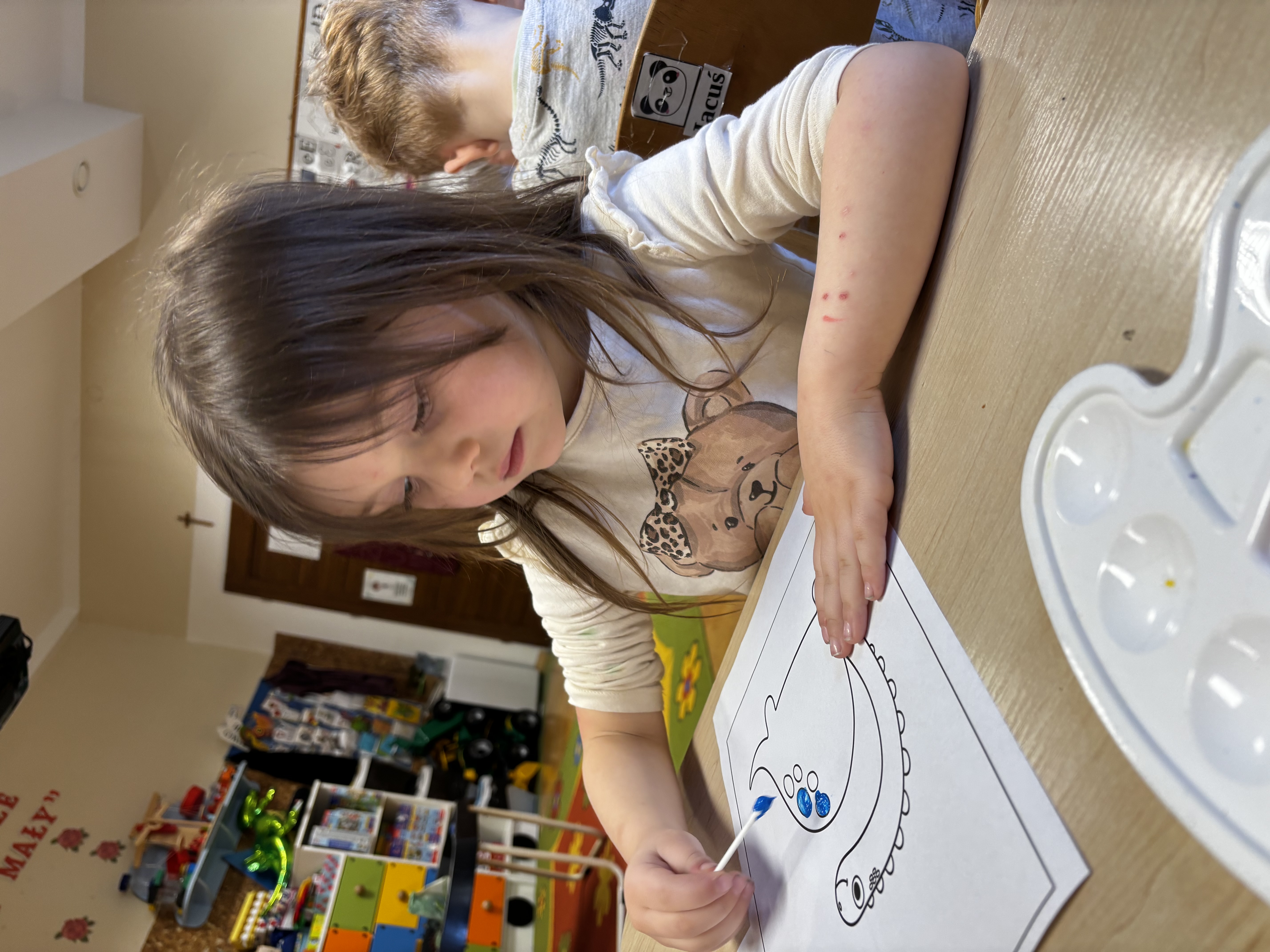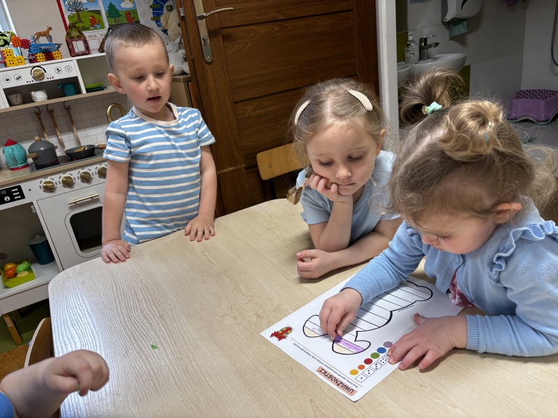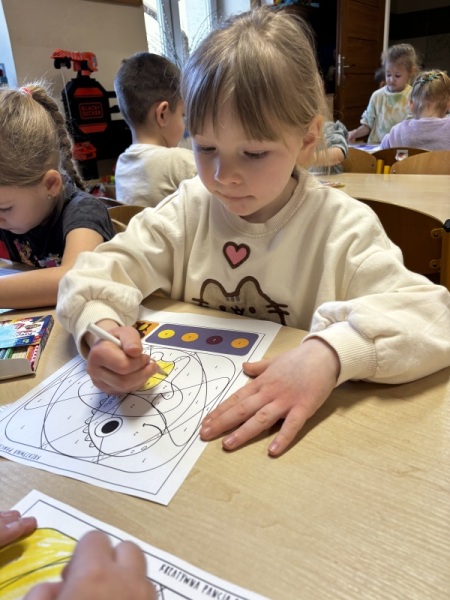 Nie zabrakło też twórczości! Podczas prac plastycznych powstały barwne obrazy wyklejane plasteliną. Na koniec dzieci układały własne obrazki z kropek, tworząc fantastyczne wzory, zwierzątka i kwiaty.