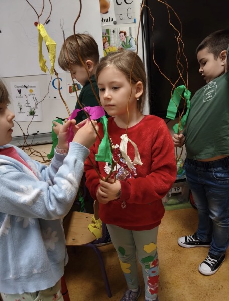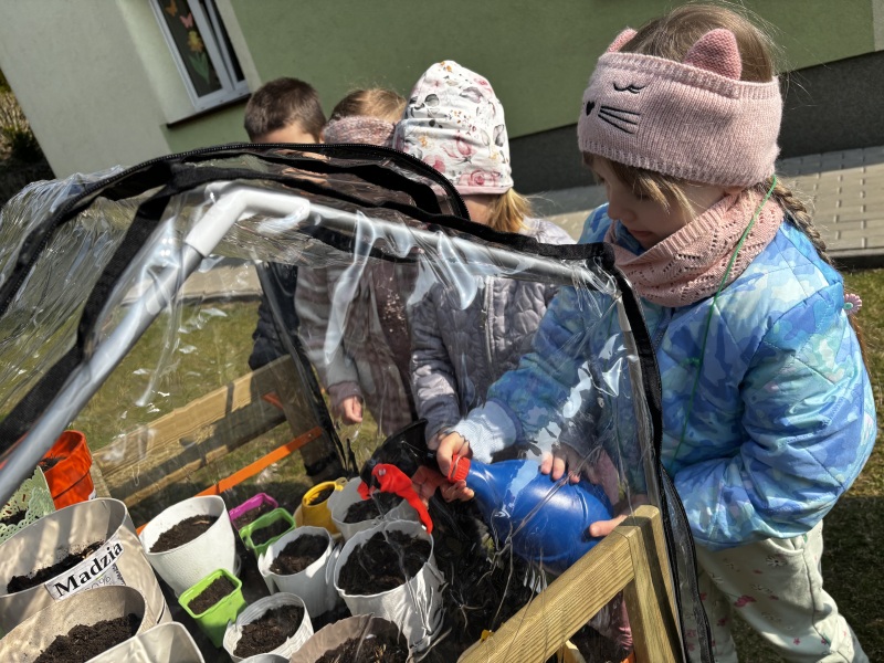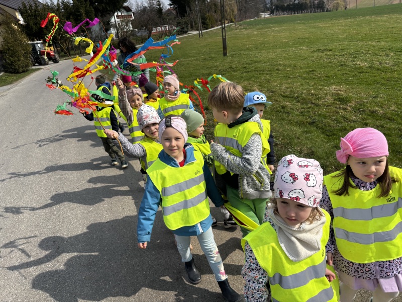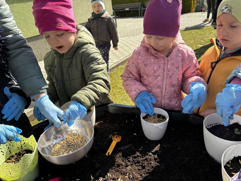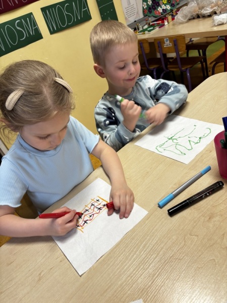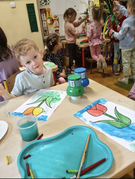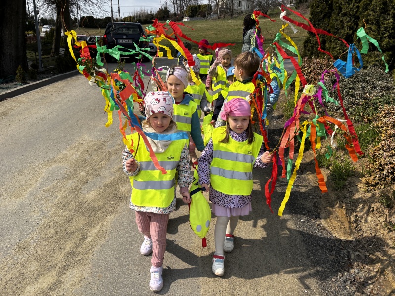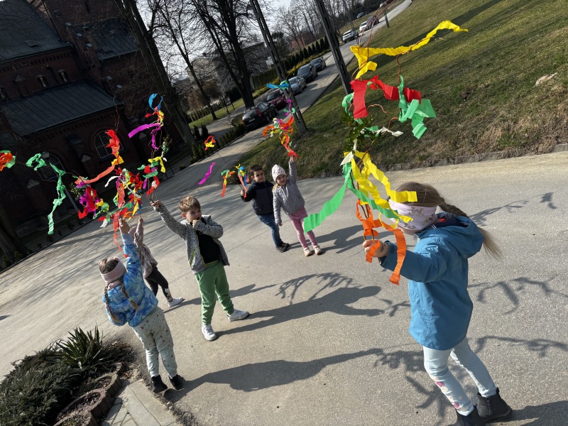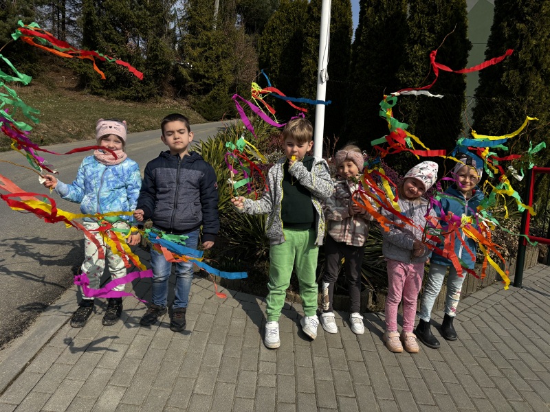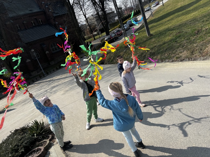 Przedszkolaki siały owies i rzeżuchę, poznając pierwsze oznaki budzącej się do życia przyrody. Wspólnie stworzyły także piękną Panią Wiosnę, która ozdobiła nasze przedszkole. Nie zabrakło również pracy plastycznej – dzieci malowały kolorowe, wiosenne kwiaty, rozwijając swoją wyobraźnię i kreatywność. Dużo radości sprawiło także przygotowywanie gaików. Z gotowymi, kolorowymi gaikami dzieci wybrały się na spacer wokół przedszkola, śpiewając wiosenne piosenki i zapraszając Panią Wiosnę do wspólnej zabawy.
