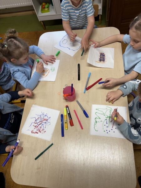 My skupiliśmy się na muzyce, która nas otacza oraz muzyce Fryderyka Chopina. Wysłuchaliśmy jego utworów, narysowaliśmy o czym ona opowiada. Przedszkolaki wykonały instrumenty muzyczne, na których zagrały gamę oraz ulubione piosenki.