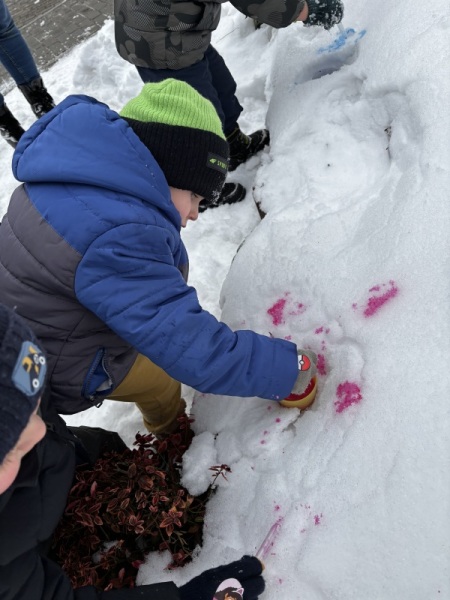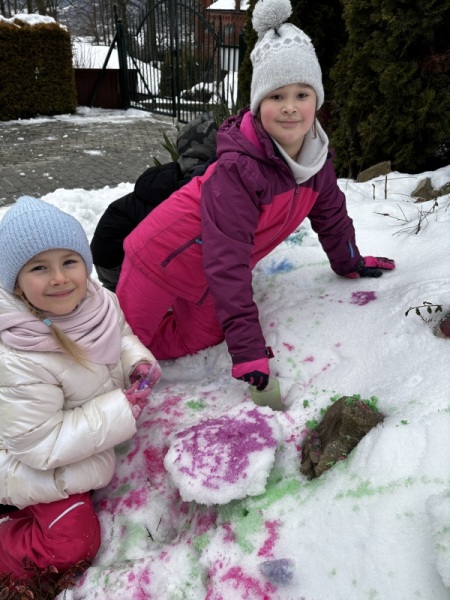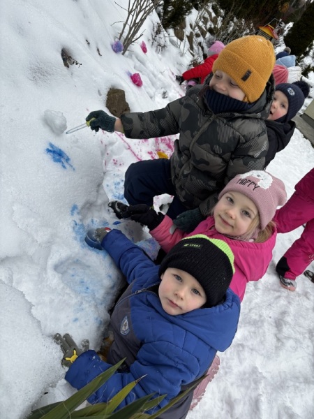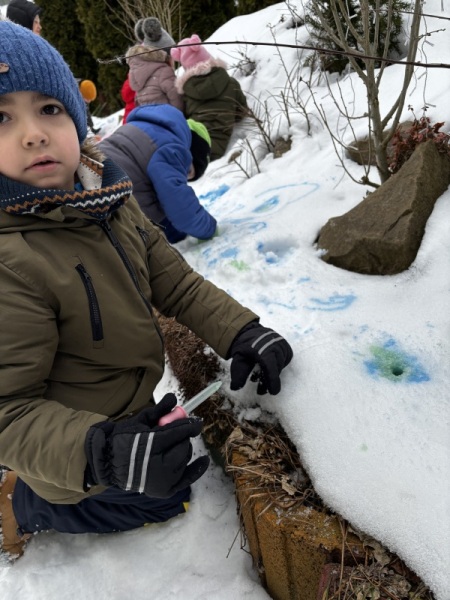 Dzieci z dużym zaangażowaniem tworzyły kolorowe wzory na białym puchu, rozwijając swoją kreatywność, wyobraźnię oraz sprawność manualną. Było to wspaniałe połączenie zabawy, sztuki i kontaktu z naturą. Zimowe zabawy sprawiły dzieciom wiele radości, a jednocześnie wzmocniły ich odporność, uczyły współpracy i pozwoliły zdrowo spożytkować energię
